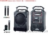 portable PA amplifier Made of good quality ABS plastic material,with stronger protection, suitable for Hand-carry, table-top or integrated tripod stand mounting. Wired/Wireless Microphone --Amplifier. Ideal for just about any PA application, including schools, seminars, conferences, worship centers, exhibitions, aerobics, shopping center presentations, sporting functions, and any medium-large scale venues. Recordable cassette players With car DVD/CD player, shockproof DVD/CD playing in 45 seconds .With AM/FM radio,MP3,MP4.USD SD MMC CARD. Built-in dual channels UHF wireless microphone receiver,up to 100 meter distance Built-in two pieces of 12V/5AH rechargeable battery with charger & 220V AC switching power supply.(automatic charging management) It can be put wireless microphones to microphone container for charge Specifications and Technical data 1.Power source: AC110V/220V/50Hz DC±12V (Built-in 2 piece of rechargeable batteries (12V 5AH) 2.Output power: 150 W 3.Loudspeaker: Built-in a full-range high efficiency 8" loudspeaker. 4.Dual channels Wireless Microphone 5.Frequency Response: UHF 500-600MHz 6.Sensitivity:10dBuV(S/N up to 60dB) 7.Received distance range:100 meter 10.Dimensions(H.W.D): 521*318*249mm 11.Weight: 13.8kgs 12.Exterior Color: Black